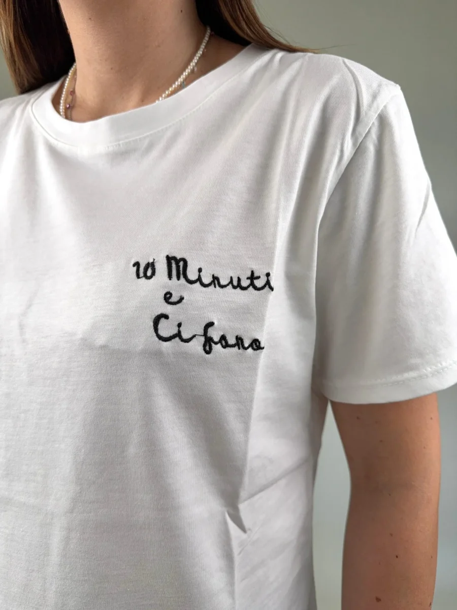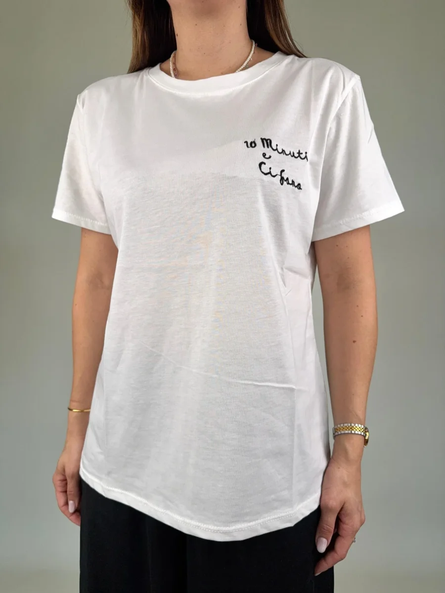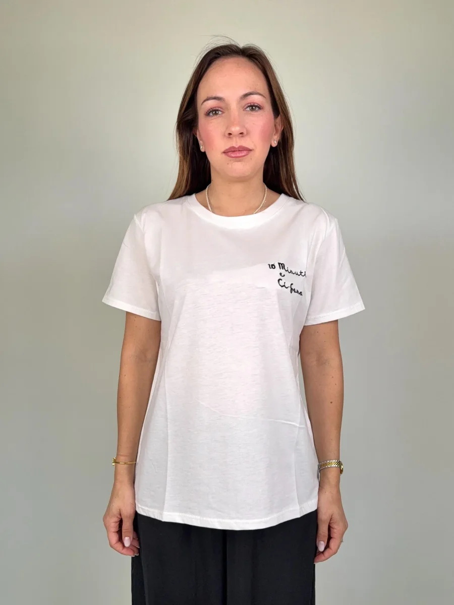 T-shirt regular in cotone con ricamo “10 MINUTI E CI SONO” Taglia unica, vestibilità regolare MADE ITALY