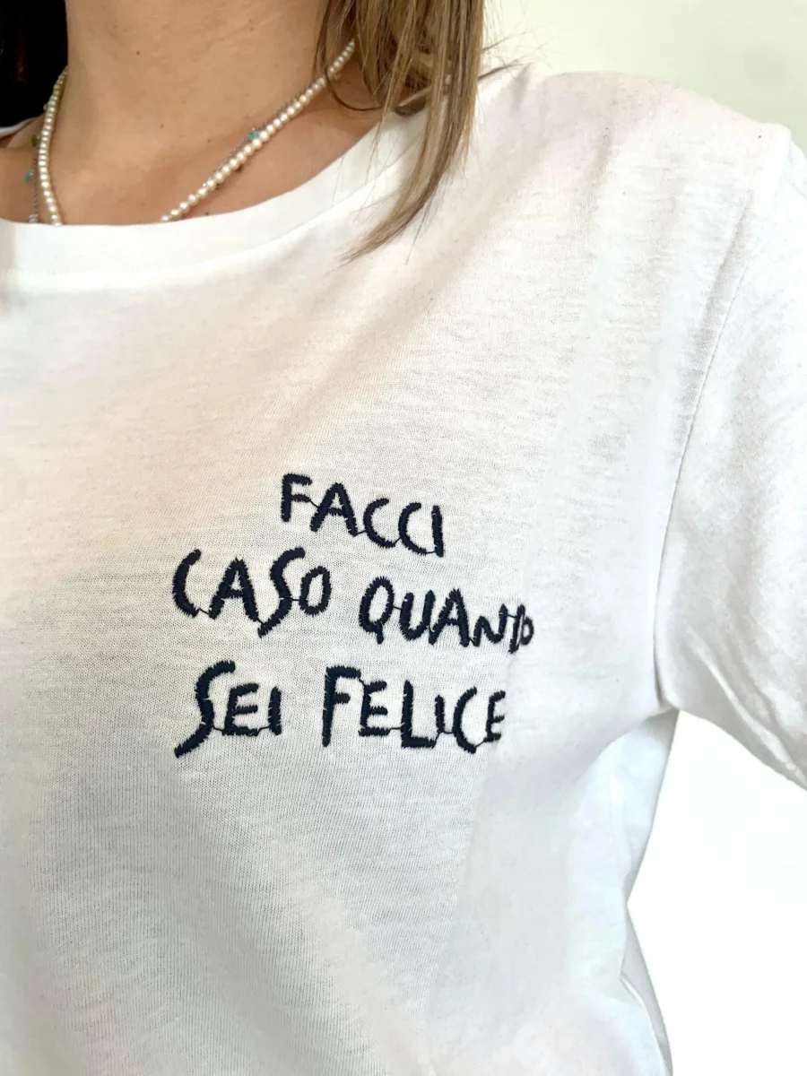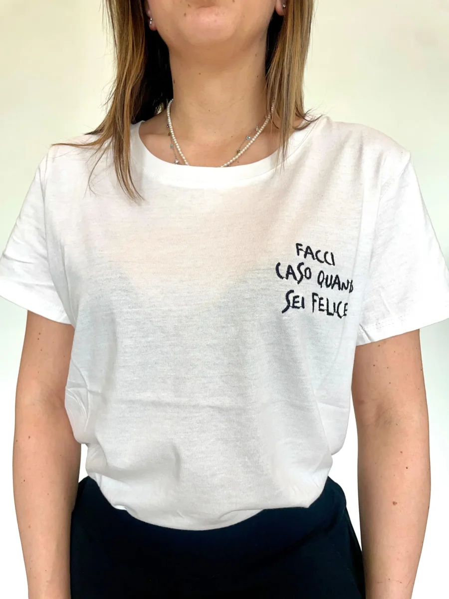 T-shirt regular in cotone con ricamo “FACCI CASO QUANDO SEI FELICE” Taglia unica, vestibilità regolare MADE ITALY