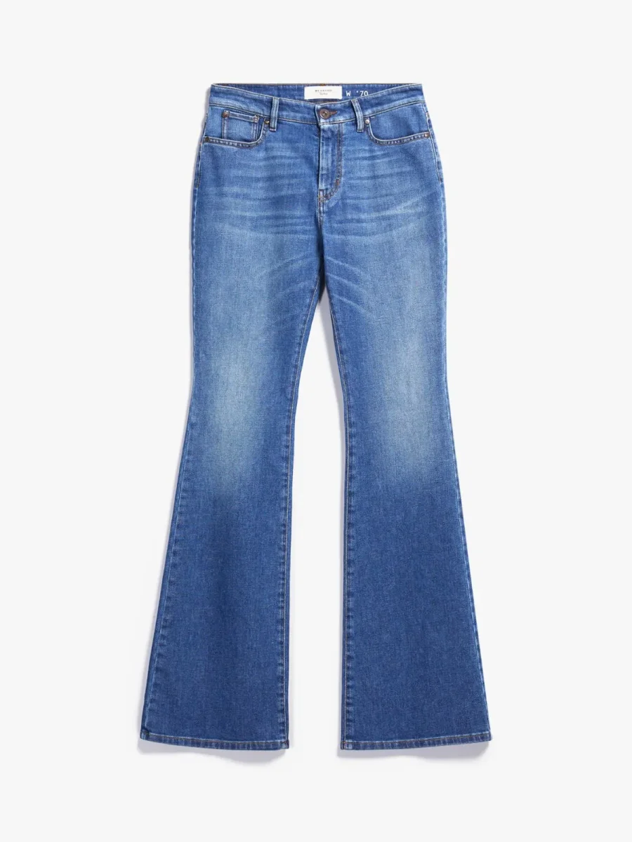 - Jeans flare realizzati in denim di cotone con trattamento used. Il modello cinque tasche presenta chiusura con zip coperta e bottone.
