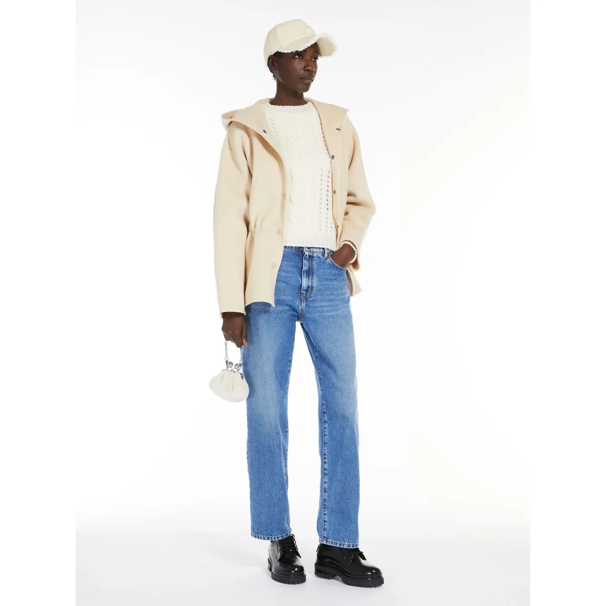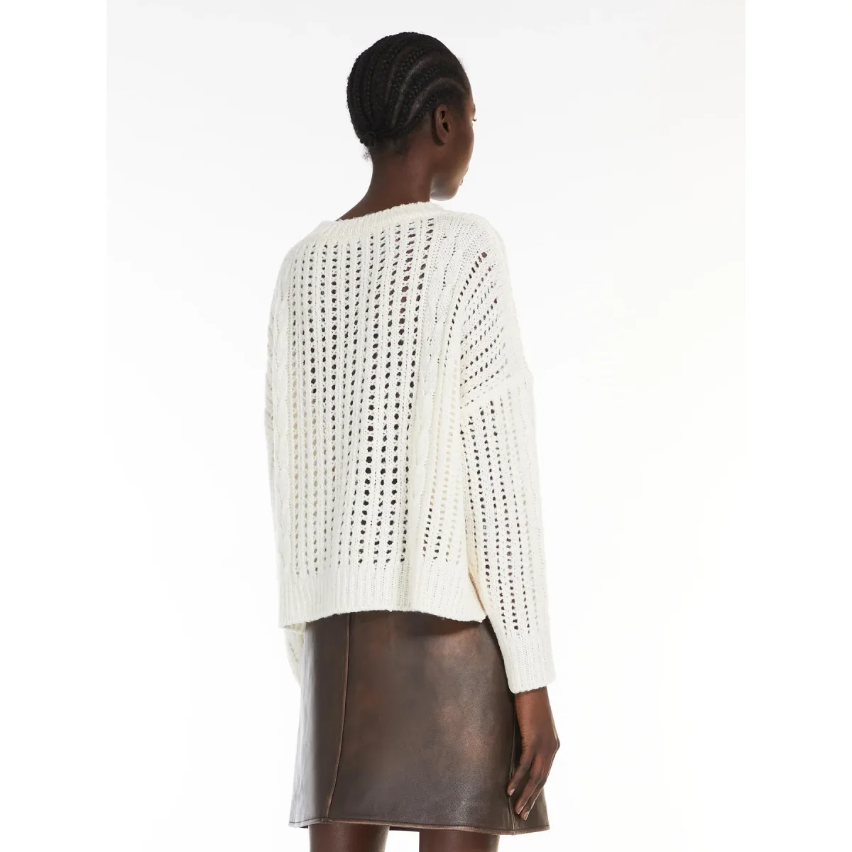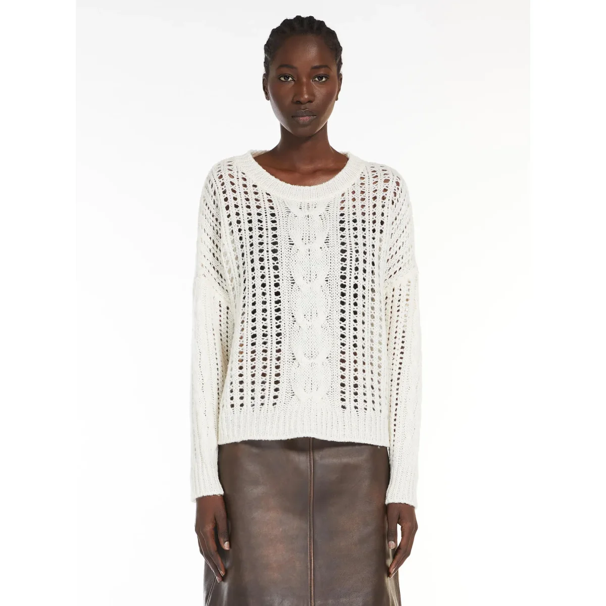 Maglia girocollo in pregiato filato di lana, impreziosita da una lavorazione a treccia con dettagli traforati. Modello dal volume oversize e lunghezza media, con maniche lunghe a giro basso e finiture a costine.