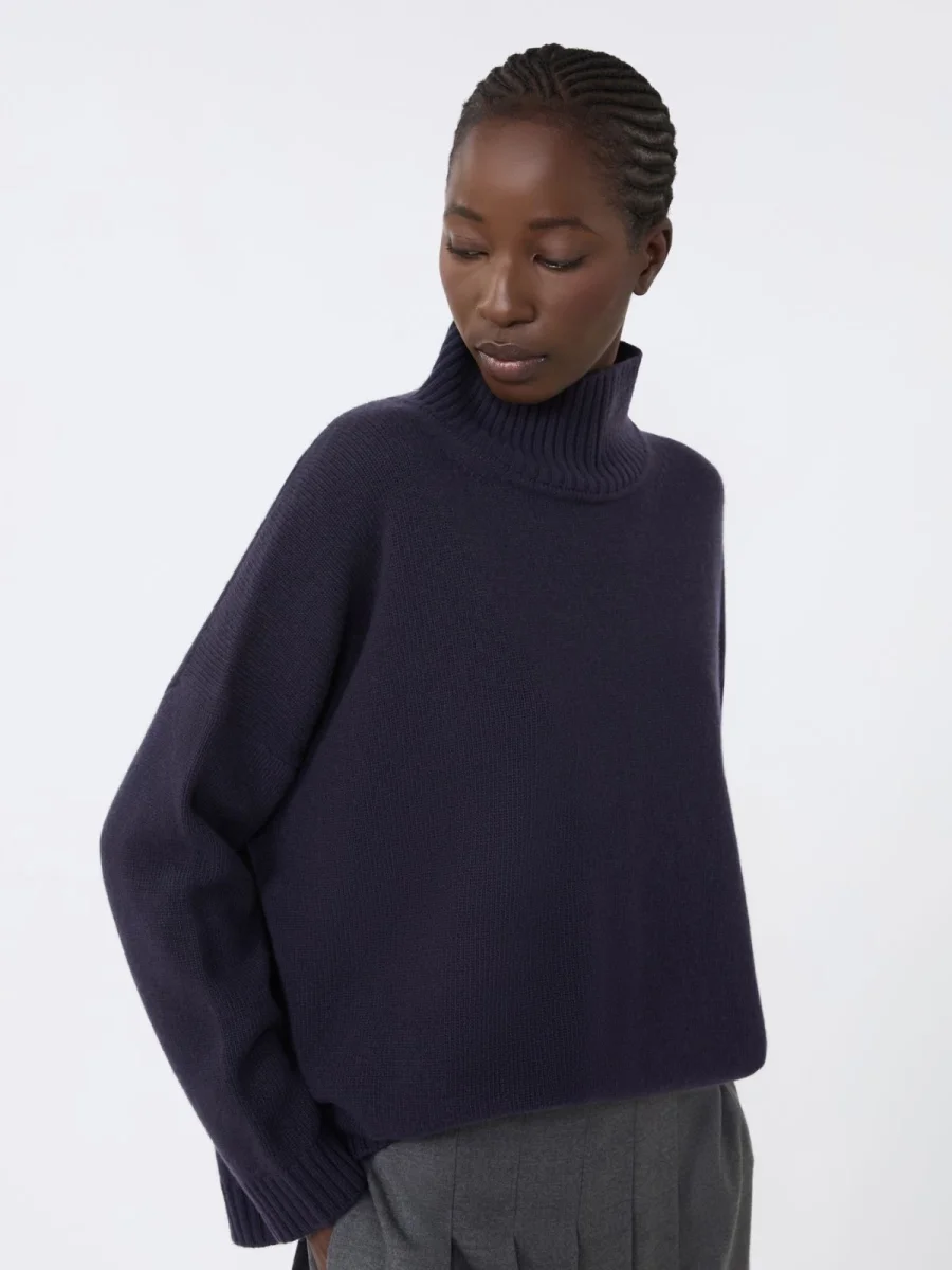 - Maglia in pregiato filato di pura lana, lavorato a punto rasato, con collo alto e maniche lunghe a giro basso. Il modello è caratterizzato da un volume morbido e linea leggermente oversize.