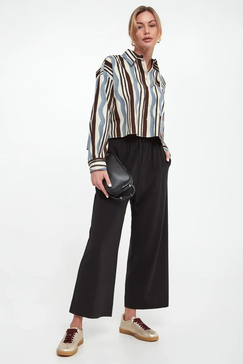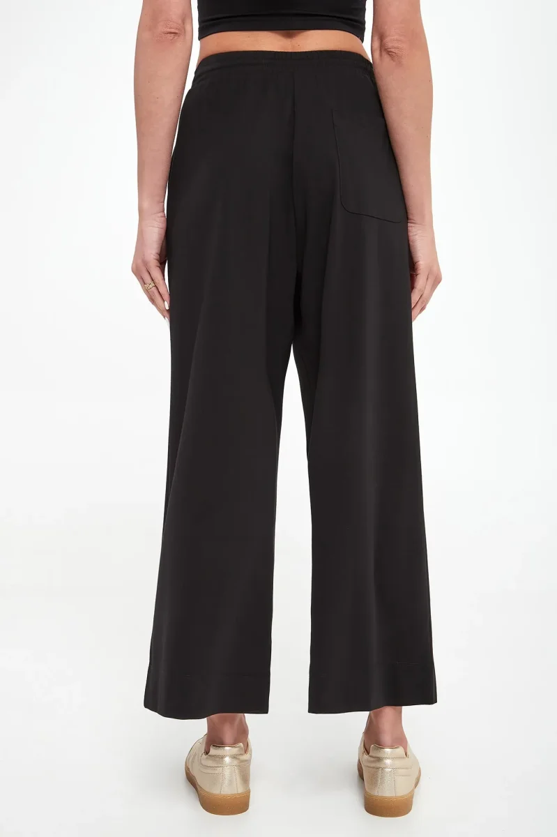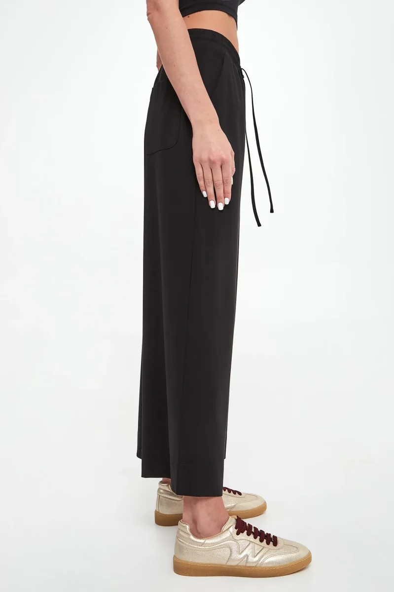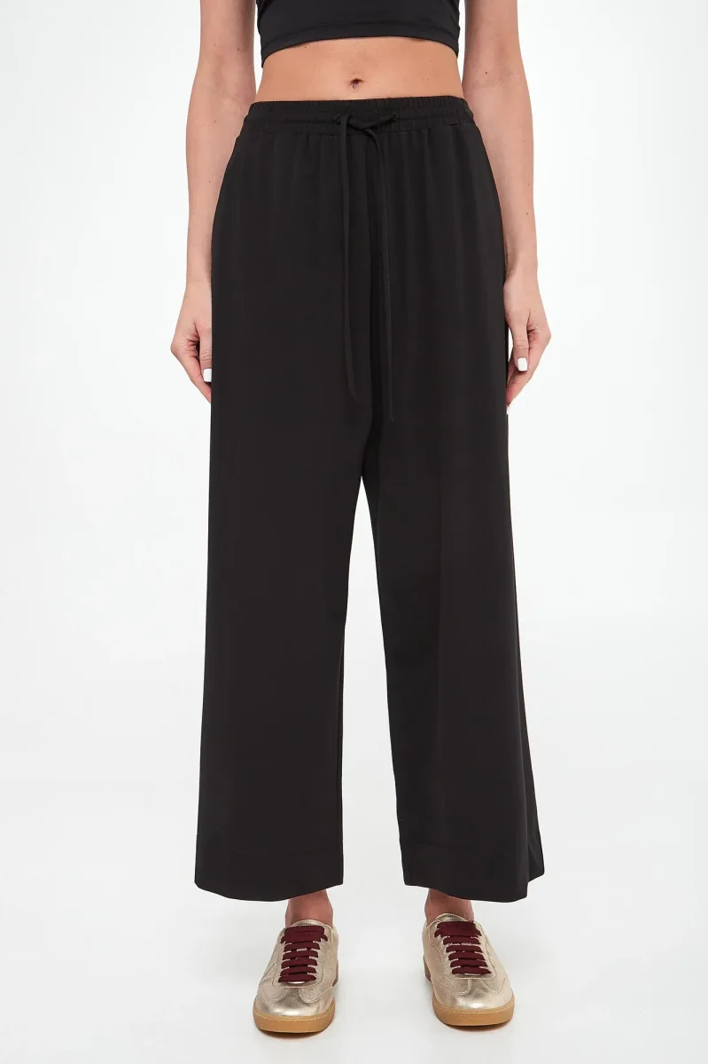- Pantalone in jersey stretch, caratterizzato da linea ampia sulla gamba, taglio cropped sopra la caviglia e vita elasticizzata con coulisse. Il modello è completato da tasche alla francese sui fianchi e tasca applicata sul retro.