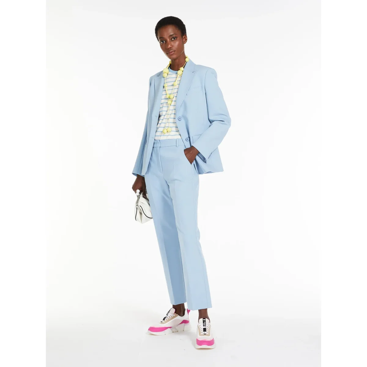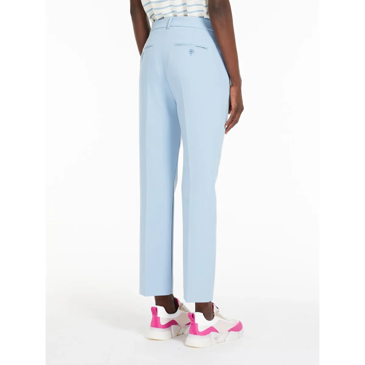 - Pantaloni in tela doppia bi-stretch dalla linea classica, chiusi con gancio e zip nascosta. Tasche alla francese davanti e a filetto con bottone dietro. Piega stirata.