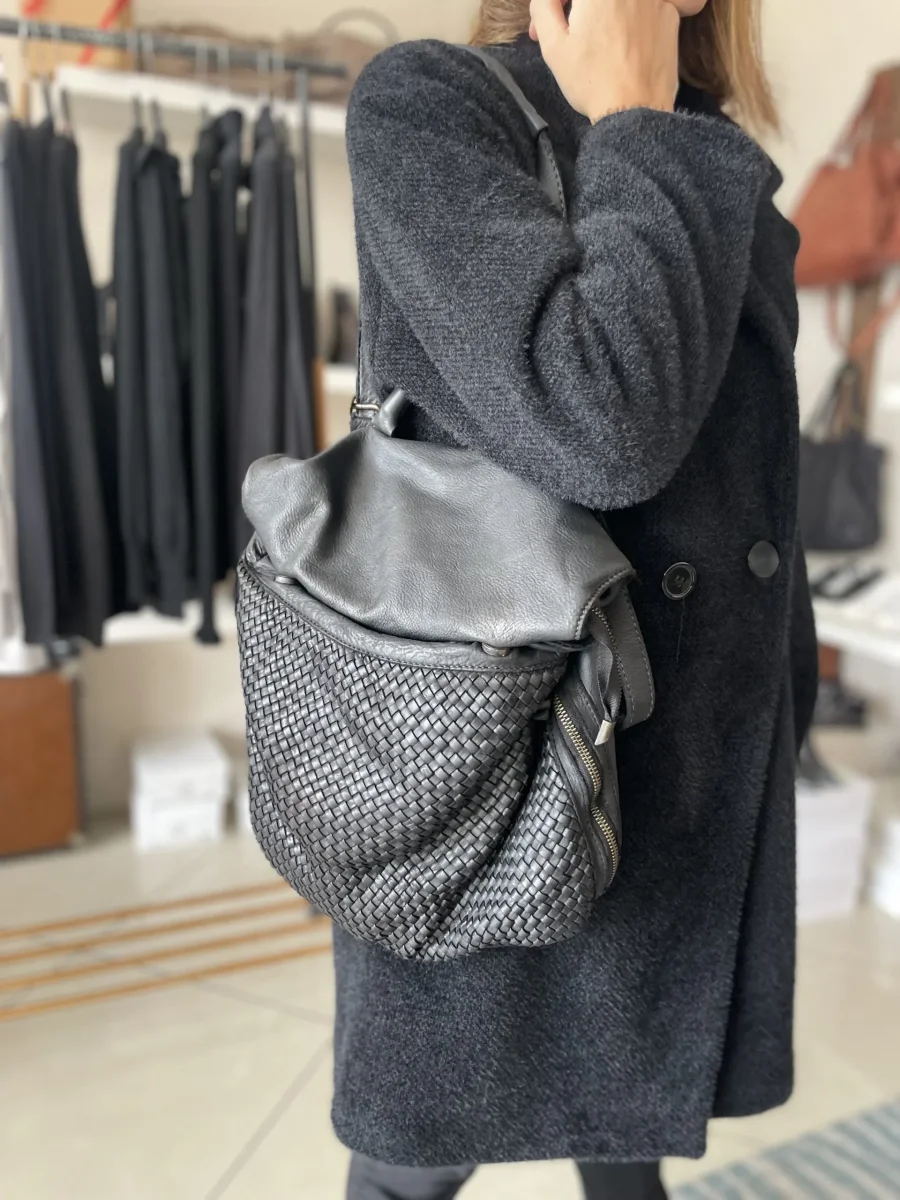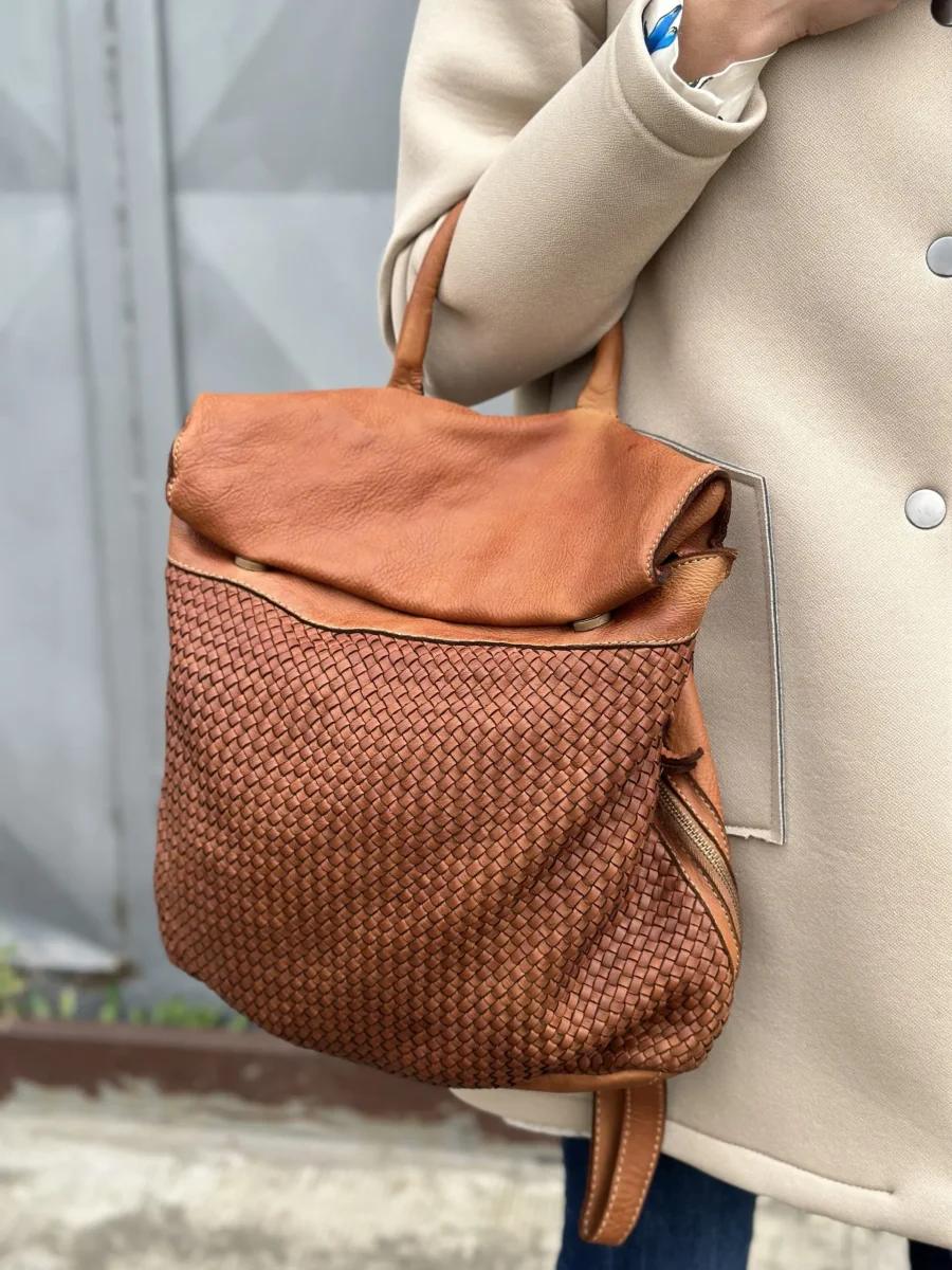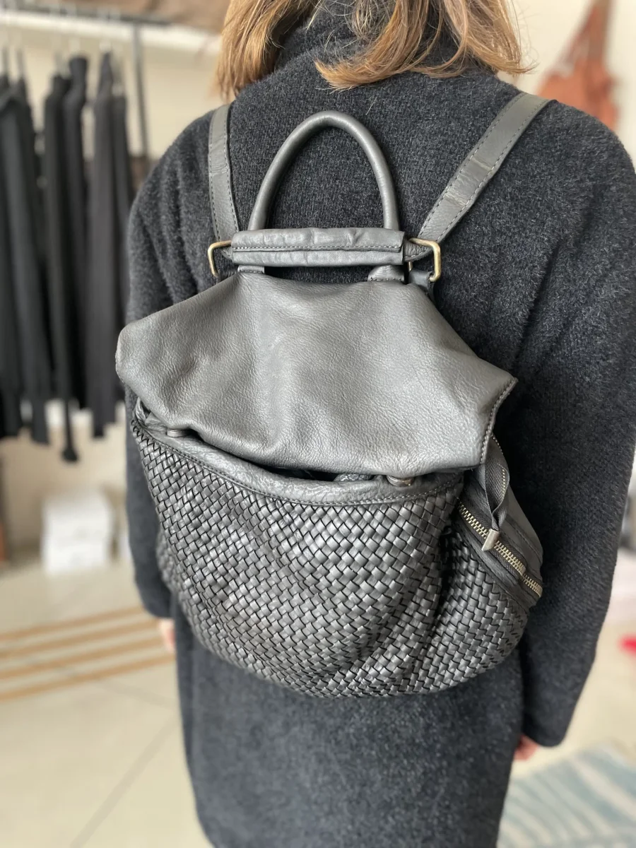 Borsa zaino in vera pelle intrecciata AVRIL. Chiusura superiore con patta e zip interna. La borsa è dotata di due tasche esterne laterali e una posteriore tutte con chiusura a zip. Può essere portata a tracolla oppure comodamente come uno zaino. Dimensioni: 35 x 35 cm Lavorazione artigianale italiana.