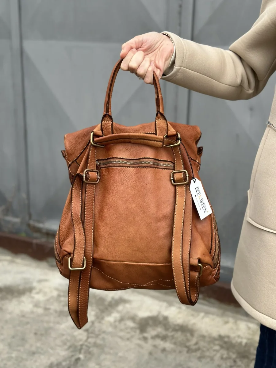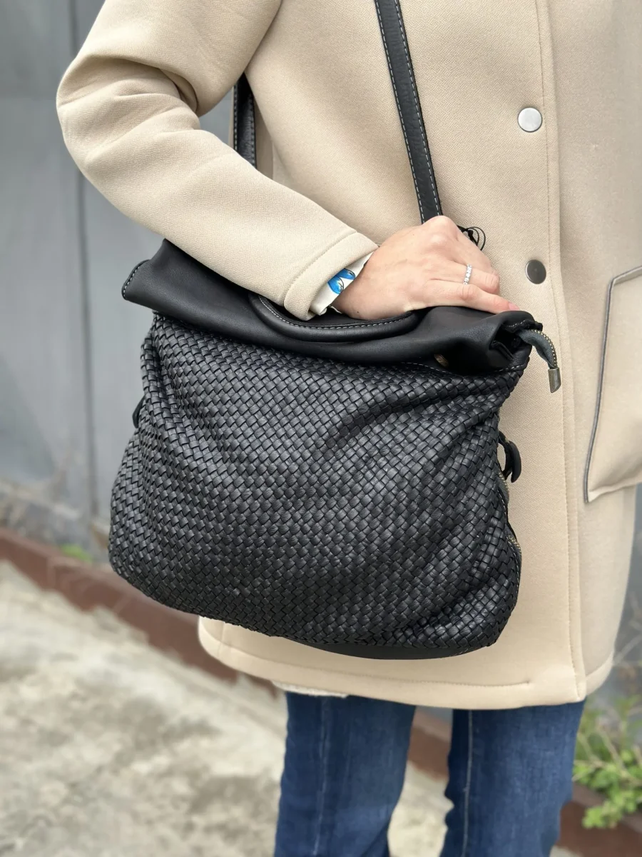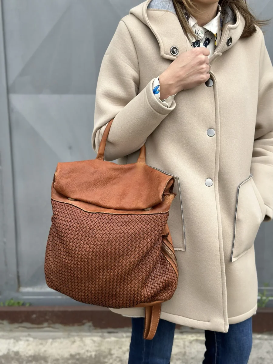 Borsa zaino in vera pelle intrecciata AVRIL. Chiusura superiore con patta e zip interna. La borsa è dotata di due tasche esterne laterali e una posteriore tutte con chiusura a zip. Può essere portata a tracolla oppure comodamente come uno zaino. Dimensioni: 35 x 35 cm Lavorazione artigianale italiana.
